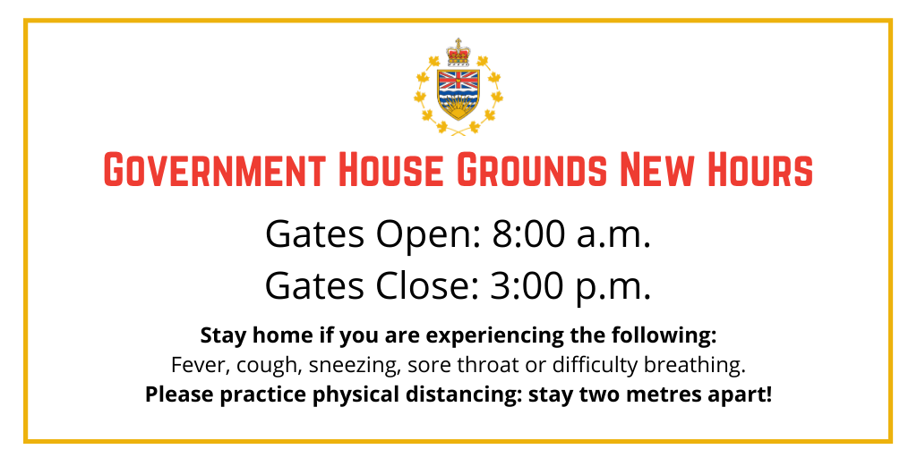 I am happy to share that the grounds of Government House will reopen to visitors on May 14, 2020. Following the recent announcements of public health experts, and in keeping with guidance set out by the province, we have developed a phased approach, meaning at this time the grounds will be open for limited hours, from 8:00 a.m. until 3:00 p.m.